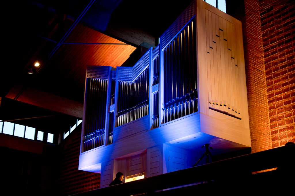 Zur Abrundung taucht eine Lichtinstallation das Innere der Neuen Kirche in stimmungsvolle Farben.