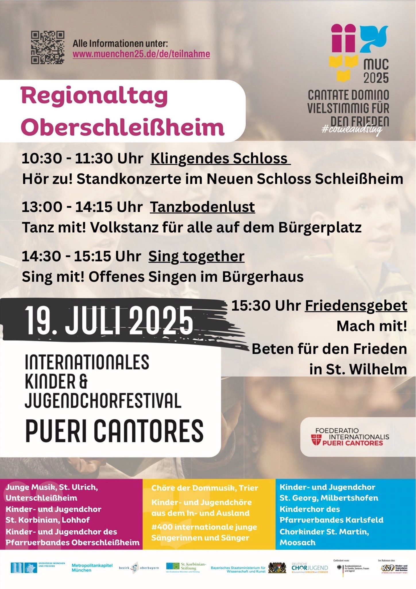 Am Samstag, dem Regionaltag des Festivals, schwärmen die Chöre aus und erkunden das Umland Münchens. Dann kommen 400 Kinder und Jugendliche aus ganz Europa in Oberschleißheim zusammen, um mit ihren Stimmen am Samstag, den 19. Juli 2025 ein kraftvolles Zeichen für den Frieden zu setzen. Dieser besondere Tag der Begegnung ist Teil des internationalen Kinder- und Jugendchorfestivals „Cantate Domino – Vielstimmig für den Frieden“, das vom 16. bis 20.Juli 2025 in München stattfinden wird (siehe oben).