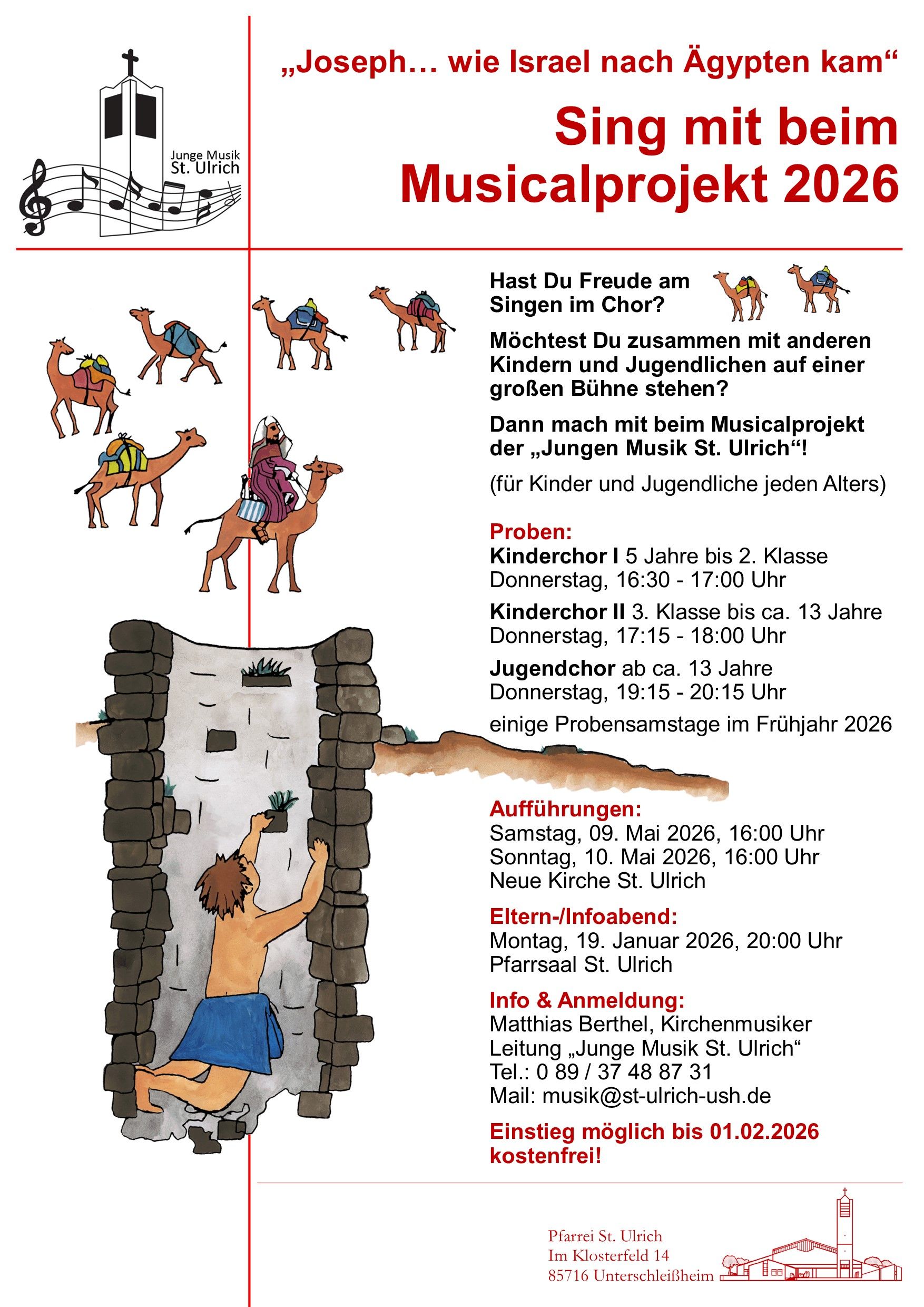 Sehr geehrte Damen und Herren der Redaktion, die Pfarrei St. Ulrich Unterschleißheim will am 9. und 10. Mai 2026 ein biblisches Musicalprojekt realisieren und sucht dazu öffentlich Kinder und Jugendliche; am Montag, den 19. Jan. 2026, um 20 Uhr ist dazu ein Eltern- und Informationsabend im Pfarrsaal bei der Neuen Kirche St. Ulrich. Wir bitten Sie, diese Suche im Jan. 2026 zu unterstützen!