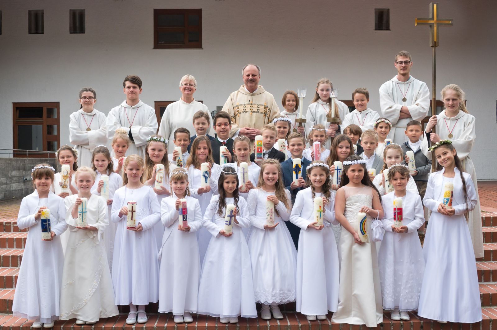 Diese 39 Kinder empfingen am 14. bzw. 15. Mai 2022 in St. Ulrich feierlich zum ersten Mal die Hl. Kommunion im Sakrament der Eucharistie: