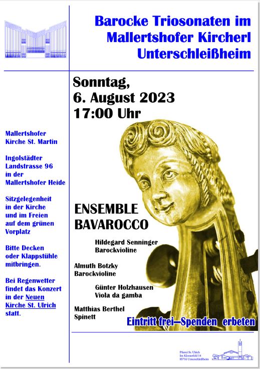 Sehr geehrte Damen und Herren der Redaktion, anbei eine Information zu einem Barockkonzert in der Neuen Kirche St. Ulrich, Unterschleißheim am 6. August 2023 um 17:00 Uhr. Ein freigegebens Bild des Ensemble BAVAROCCO ist hier (Namen unten und auf der Musik-Seite.)