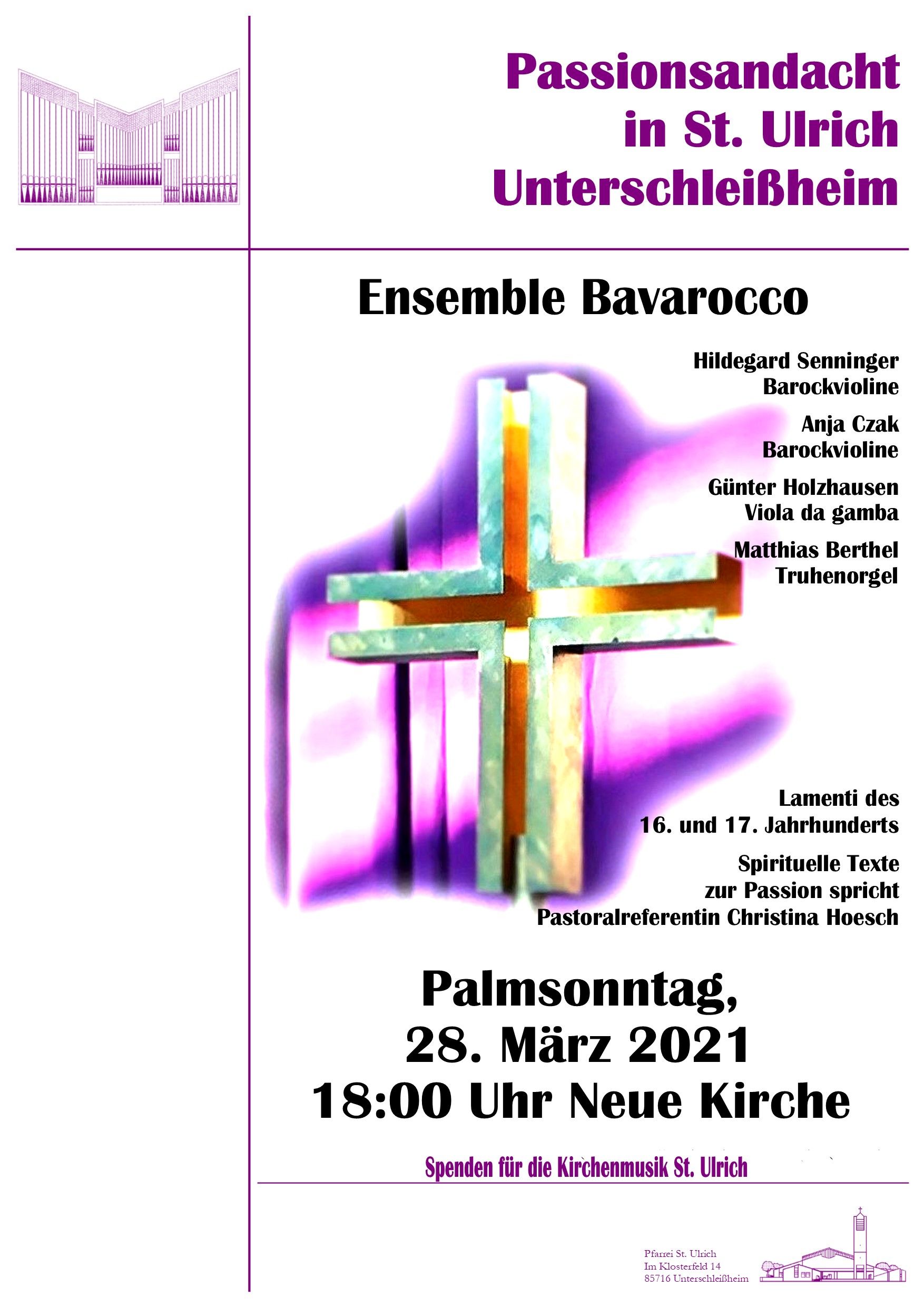 In der Passionsandacht bringt das Ensemble Bavarocco eine Auswahl an Stücken barocker Instrumentalmusik aus dem 16. und 17. Jahrhundert zur Gehör.